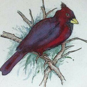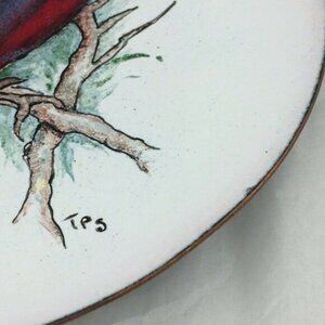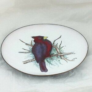 Vintage Red Cardinal Bird Enamel on Copper Plate Christmas Signed TPS Handmade