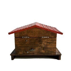 Vintage Red Chalet/Cabin Shaped Musical Jewelry Box with Mirror