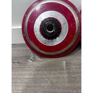 Vintage Red Circular Industrial Components with Central Gearing Wheel