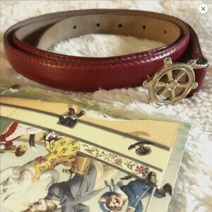 Vintage Red Genuine Leather Novelty Belt With Gold Nautical Ship Wheel Buckle