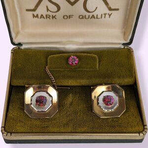 This vintage cufflink and tie pin set is made of gold and silver tone metals and red glass with an AB finish, and comes in its original box (green, hardshell). The cufflinks are octagonal, and each consist of a gold tone layer, a silver tone layer, and then the red glass. The tie pin is a single red glass stone with a chain in back. The set has normal vintage wear but would benefit from a rinse and clean.
