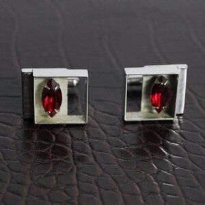 Vintage Red Marquise Cut Glass Cuff Links Silver Tone