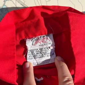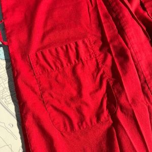 Vintage red kimono style robe made by Plain Blossoms in China. 65% polyester, 35% cotton. Embroidered mountain scenery on back, big pockets on front. Has belt loops, but no belt included. Tagged as a size small, measures 24" across shoulders, 24" pit to pit, 48" long.