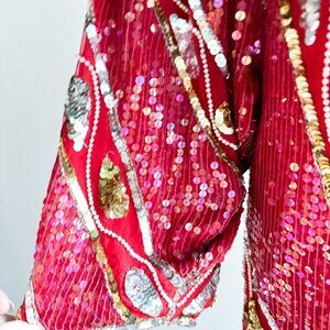 Vintage Red Silk Beaded Embroidered Long Sleeve Sheath Dress S/M.
