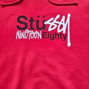 Selling a Red vintage Stussy hoodie with the Graffiti logo featuring the nineteen eighty text. Fits true to size!