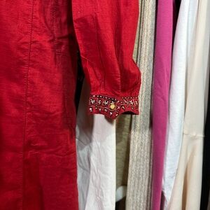 This elegant red kaftan features intricate embroidery, perfect for adding a touch of sophistication to your wardrobe. Ideal for special occasions or casual wear.