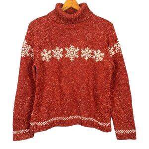 vintage holiday sweater, retro snowflake pullover, red knit turtleneck, cozy winter jumper, festive christmas sweater, soft knit pullover, breathable turtleneck sweater, vintage red jumper, size medium sweater, retro winter fashion, snowflake knitwear, comfy holiday clothing, festive red sweater, timeless winter style, vintage christmas knit, cozy winter aesthetic, cabincore