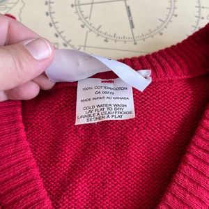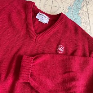 Retro red Pride promotional sweater. Logo is embroidered in white, sweater is made by Corporate Knit of Canada. 100% cotton, not tagged for size, would say it fits as a large or extra large. Measures 22" across shoulders, 22" pit to pit, 28" long.