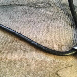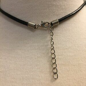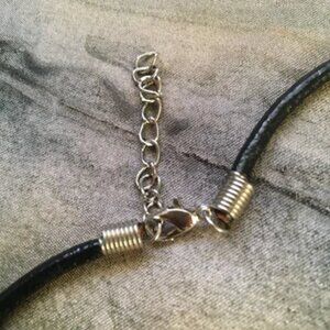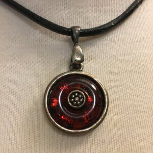Good preowned vintage condition, deep-red glass/enamel circle pendant encapsulated in metal on a black leather strand with a silvery chain and lobster clasp closure. There's some weight to the pendant, the strand is nice and thick. Some wear here and there, but otherwise good condition.