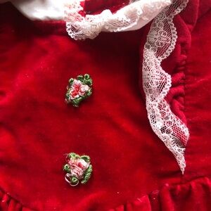 Charming red velvet baby dress. Features a delicate lace collar. Perfect for special occasions.