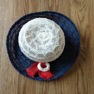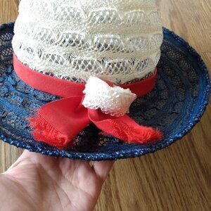 Vintage Red, White and Blue Hat Mesh Lace Helen Joyce Original USA 20.5" Retro