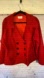 Pretty in classic bright red. A will blend with a double breasted button closure. It is lined on the inside and has two functional front pockets. This would be lovely for the winter and holiday season ahead.