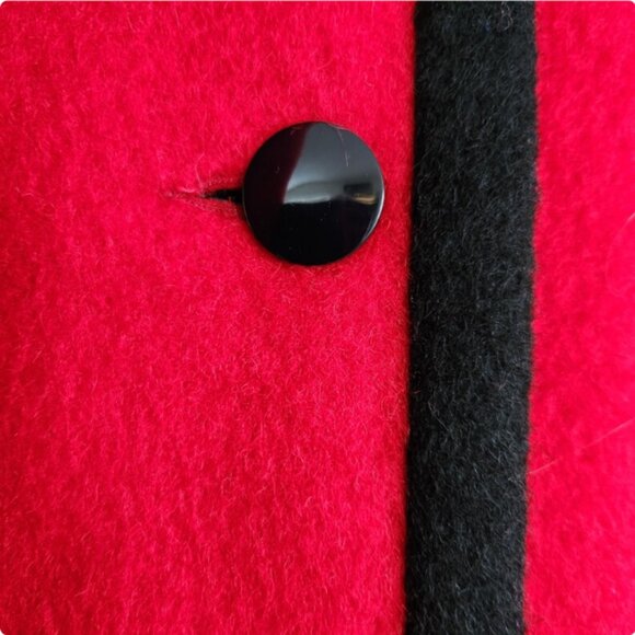 Make a bold entrance with this striking vintage red wool coat from Sears Fashion Place. Tailored in a classic midi length with a straight silhouette, this fully lined winter coat features timeless black trim along the collar, button line, and shoulders. It fastens with elegant black buttons down the front and includes practical side pockets for warmth and convenience. A coordinating neck scarf completes the look, adding an extra layer of vintage charm and cozy sophistication.