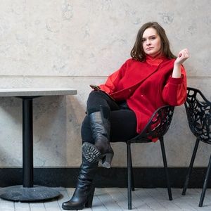 The jacket has a offset mock neck when done up, and closes with silver metal buttons. The bottom hem is a tapered cut and It is made out of 35%wool.