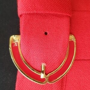 This vintage Antels MXM A-line skirt offers timeless elegance in 100% pure virgin wool, featuring a classic pleated design. It comes with a matching fabric-covered belt detailed with gold trim and red enamel, providing a sophisticated touch. The skirt is designed with a side button and zipper, with elastic on both sides of the waistband for an easier fit. Minor flaws as noted do not detract from its vintage charm.