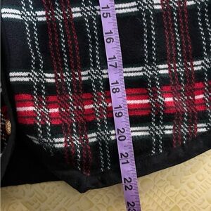 Stylish vest featuring a red and black plaid pattern. Embroidered crest detail adds elegance. Perfect for layering.