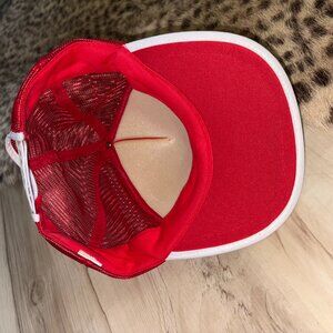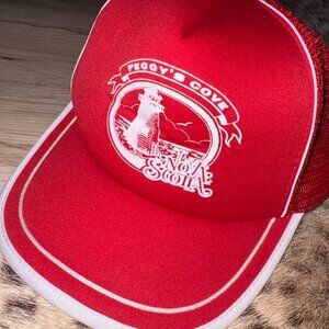 Red and white, 'Peggy's Cove Nova Scotia' memorabilia trucker hat. Adjustable at back.