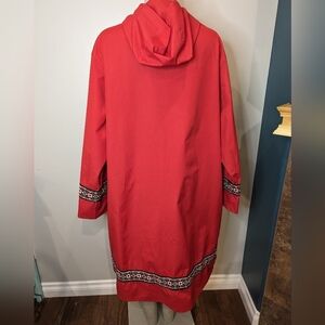 Vintage 60s/70s Red hooded shell overcoat Jacket with embroidery. Untagged no size. This is a generous plus size 1x/2x or 18/20 Works as a stand alone rain coat or can be layered with an undercoat for Winter wear.
