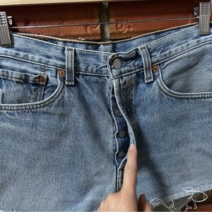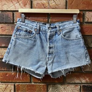 • Style: Vintage Levi’s 501, redone into cutoffs; raw frayed hems, button fly, classic 5-pocket.