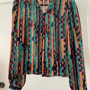 Eye-catching vintage blouse by Regina Porter in a vivid multicolor abstract print. Feels like a lightweight polyester with a silky drape. The pattern is an 80s-inspired painterly ikat with bold jewel tones: emerald, fuchsia, mustard, aqua, and black.