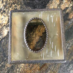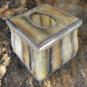 Very good vintage resin tissue box cover. A opaque resin in marbelized yellows, tans and goldish browns and accented by a silvery soldered trim. A very nice piece and perfect size for concealing almost anything.