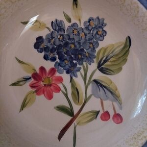 Lovely hand-painted ceramic bowl. Sky blue lip with raised white vine. Inside bowl is pretty painting of flowers. Approx 8 5" diameter. Use as a display piece. Would look great on a kitchen or dining room wall. Flora.