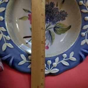 Lovely hand-painted ceramic bowl. Sky blue lip with raised white vine. Inside bowl is pretty painting of flowers. Approx 8 5" diameter. Use as a display piece. Would look great on a kitchen or dining room wall. Flora.