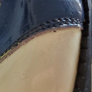 AMAZING vintage wedge patent leather red white and blue ADIDAS golf shoes. It looks like they were maybe worn once. Slight scuff on right toe and left heel (see pics). Some discoloration under lace bed but it's covered by the fringe piece. Needs laces. Spikes are all solid and spiky :)