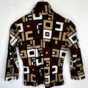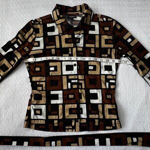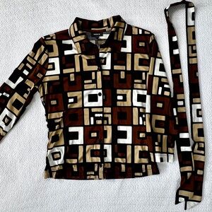Vintage Mexx Retro Art Deco 70's Style Y2K Shirt w Tie/Belt/Sash and 3/4 sleeves in Brown, Black, Tan and White. Made by Mexx. Women's Size XS. Excellent condition. No signs of wear, stains or scents.