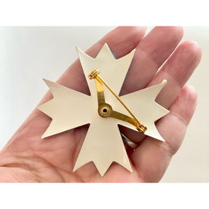 This brooch features a Maltese cross design. It is constructed from metal with a blue enamel finish and cream-white colored enamel accents. The brooch measures approximately 3 inches in diameter. It has a pin-back closure. The central part of the brooch has a round cream-colored enamel.