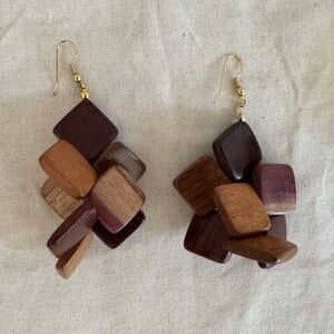 2) A pair of dangler earrings with 8 assembled wood squares and hypo allergenic new gold metal pierced ear hooks. 3" drop.