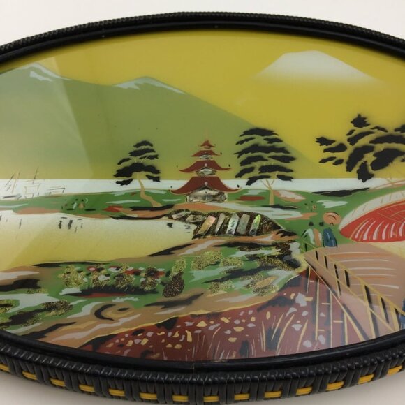 Beautiful vintage reverse painted tray with Mother of Pearl or abalone shell insets. Features a nature scene set in Japan. I can't tell what woven frame and handles are made from. Feel like they may be plastic.