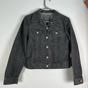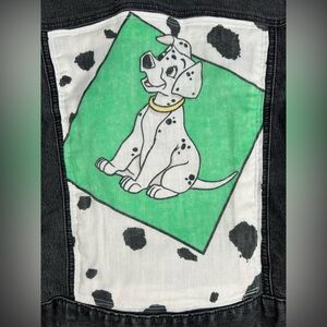 One of a kind reworked denim jean jacket! The jacket is a Vintage Made in USA Guess black denim jacket that offers some stretch. Reworked with a large Disney 101 Dalmatians patch from a vintage sheet on the back.