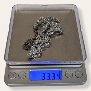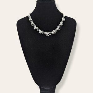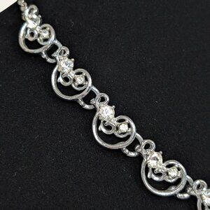 This vintage necklace is made of a silver tone metal and has an adjustable hook closure. The necklace is just above choker length (16.25" vs 16") when the hook is at the very end of the chain (like pic 6). This might be the intended length, as the links in the rest of the chain seem too small for the hook. The front of the necklace features 9 small rounded links with cut-outs, each accented by 2 small white/clear rhinestones. In pic 4 if you look closely, you can see that some of the stones are yellowing and not as bright as they once were. There is normal wear throughout, including what has been mentioned, as well as tone change in the hook.