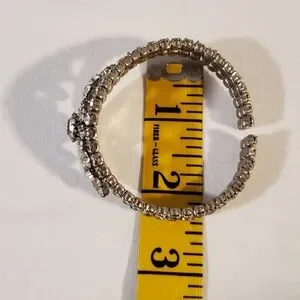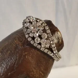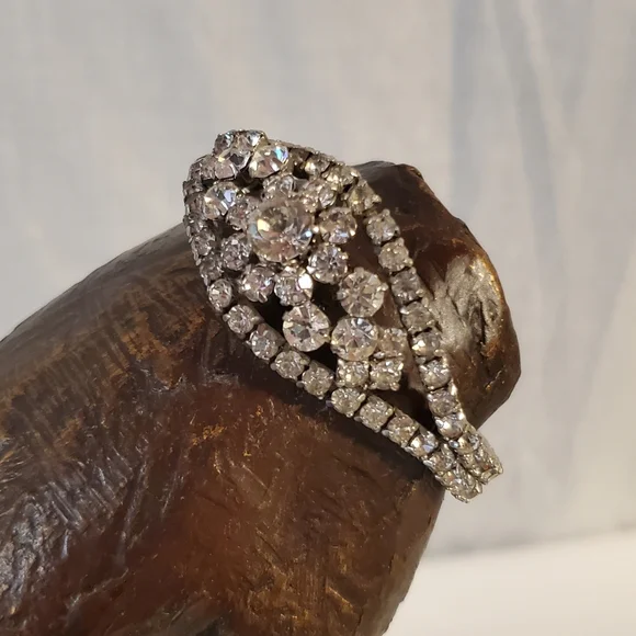 Striking vintage rhinestone cuff bracelet featuring a tiered, crown-style center design with clear crystal rhinestones set in silver-tone metal.
