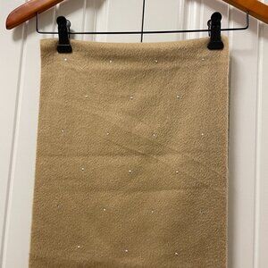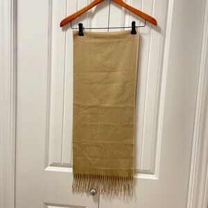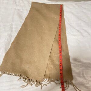 Elevate your winter wardrobe with this luxe vintage camel scarf, accented with subtle silver rhinestones throughout for a touch of sparkle. Made from an ultra-soft blend (unlabeled), this piece features fringe ends and a neutral tone that pairs effortlessly with any outfit. Perfect for adding warmth and glamour to chilly days.