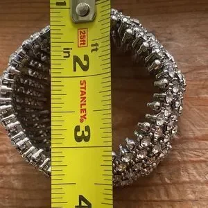 What a beautiful and substantial piece this bracelet is! Sparkles and shines, it’ll be sure to turn heads! It is heavy but comfortable. All the crystals are intact and the elastic is still in good shape.