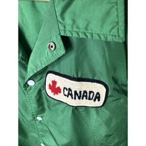 Vintage green nylon Canada team-style coaches jacket by R’ca Sportswear. Features snap button front, white piping trim, and a bold “Canada” patch with red maple leaf. Lightweight nylon shell with retro athletic styling.
