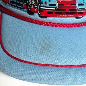 Details- Blue and black trucker style hat featuring racecar driver Richard Petty