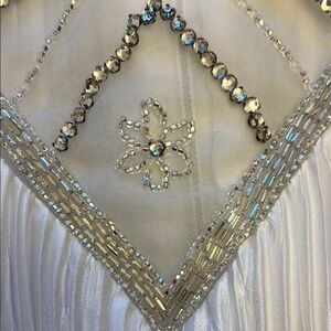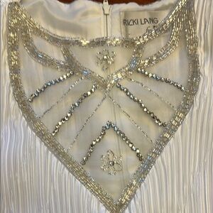 Stunning Vintage Ricki Lang for Nuit White Primitive Pleated Midi Dress from the early 80s or late 70s. Beautiful silver beading and sequins/rhinestones on a V neck mesh bodice. 3/4 length sleeves with generous centre back zipper closure. A truly unique, one of a kind vintage garment. Chic and simple and oh so beautiful.