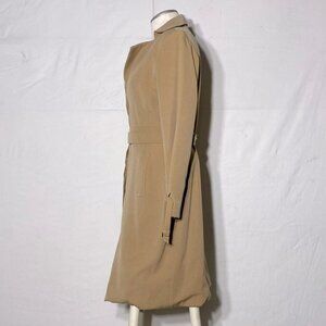 Great vintage condition. One very small spot on collar shown in pics. No holes or pilling, no pulls. Seam coming apart on inner lining, see pics. Pretty tan colour. Buttons up and has a waist tie. Size M, measurements in pics.