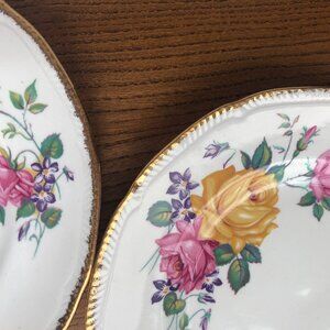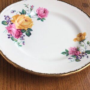 Vibrant floral pattern with yellow and pink roses and tiny purple blooms. Warranted 22 Kt. Gold trim with no chips, cracks or crazing!