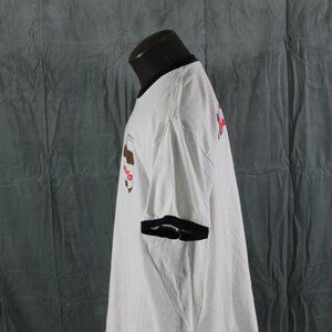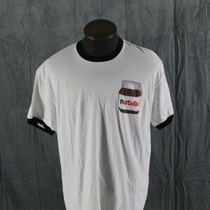 Up for sale is a ringer t-shirt. It has a white base colour with black trim. The front of the shirt has a jar of Nutella screened on left side and Nutella screened from shoulder to shoulder on the back of the shirt. What a great shirt do not miss out on it.