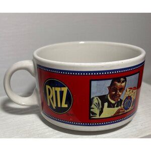 This ceramic mug features iconic Ritz and Premium Plus branding with vibrant retro advertising designs. A unique addition to collectible kitchenware or retro branding enthusiasts.