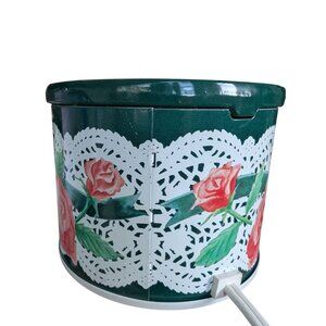 Vintage Rival Potpourri Crock Pot Electric Simmer Pot 3206 in Green Lace Roses design, made in the USA. This medium-sized ceramic pot features a floral pattern with a glossy finish, perfect for any room in your home. The Rival 3206 RL Simmer Pot is a wall plug-in type with deodorizing properties and slow-burning capabilities, ideal for creating a calming atmosphere with your favorite scents. A charming addition to your home fragrance collection, this country-style potpourri crock by Rival is a timeless piece for adults who appreciate aromatherapy.