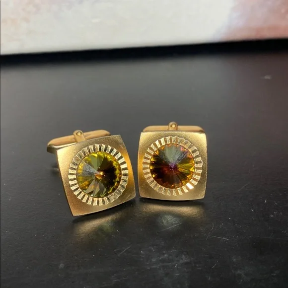 🎁 Vintage Rivoli Crystal Cuff Links Amber Rivoli Rhinestone