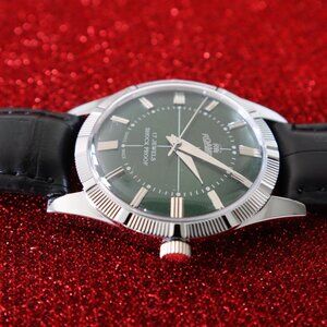This Watch made by Roamer is a beautifully preserved vintage timepiece that combines refined Swiss engineering with elegant aesthetics—featuring a vivid dial accented powered by a fully serviced 17-jewel manual-winding movement, all housed in a well-balanced 36 mm case paired with a comfortable leather strap, making it a highly collectible and value-driven classic.