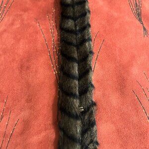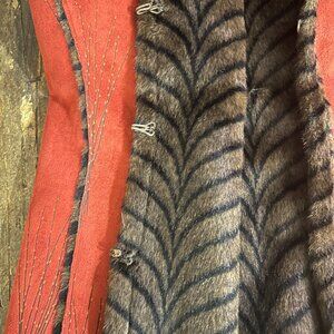 Gorgeous vintage Robert Kitchen vest, made in Canada, featuring a rust-colored faux suede exterior embroidered with tree-like motifs and lined in striped brown faux fur. A unique, textured statement piece that blends craft, culture, and cozy luxe vibes.