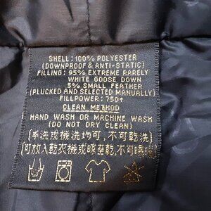 Minimalist cut with no collar and no external pockets, giving it a stark, utilitarian silhouette. Filled with 95% white goose down, 5% small feather, rated at 750+ fill power – exceptionally warm while remaining lightweight (approx. 430g).