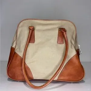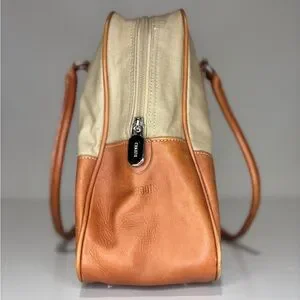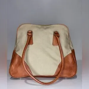 This elegant women's bag features a stylish tan and cream design, perfect for any occasion. Its versatile colors make it a must-have accessory. Width 11 in and height 10 in.